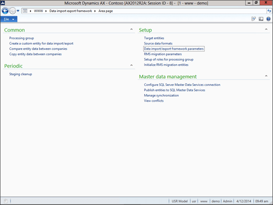 First we need to make sure that the Data Import Export Framework is configured. To do this, click on the Data Import/Export Framework Parameters menu item within the Setup group of the Data Import Export Framework area page.