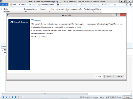 When you return to the Select Entities For Processing Group maintenance form, point the Sample File Path to point to the sample file that you just created.