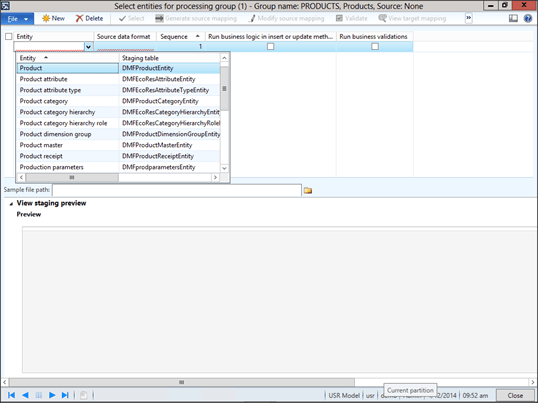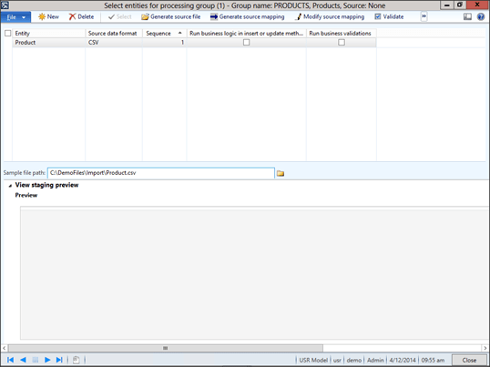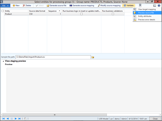 Now you can preview the data that you put in the import file by clicking on the Preview Source File menu button within the Select Entities For Processing Group maintenance form.