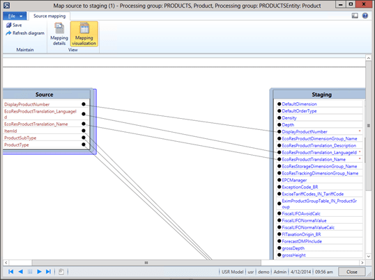 If you click on the Modify Source Mapping button in the menu bar, then you will see what Dynamics AX has really done – link all of the source fields to the import staging table.