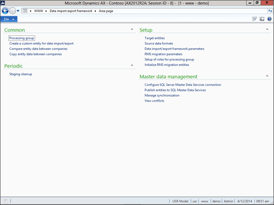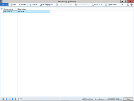 Now we can start importing data. To do that, just click on the Processing Group menu item within the Common group of the Data Import Export Framework area page.