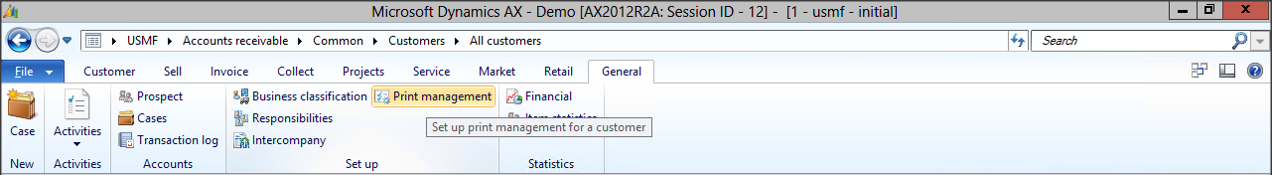 Step 1: From the customers maintenance form, select the Print Management option from the Setup group of the General Ribbon bar