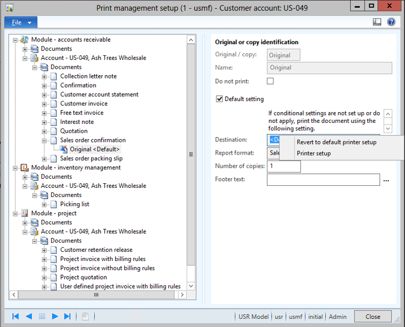Now when you print out the order confirmation, select the Use print management destination and the defaults that are defined against the customer will be used and your document will be automatically emailed to the customer.