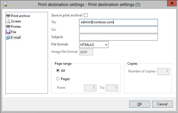 Step 4: When the Print destination settings dialog box is displayed, you can select the Email option, and specify the default email address to deliver the document to for that customer.