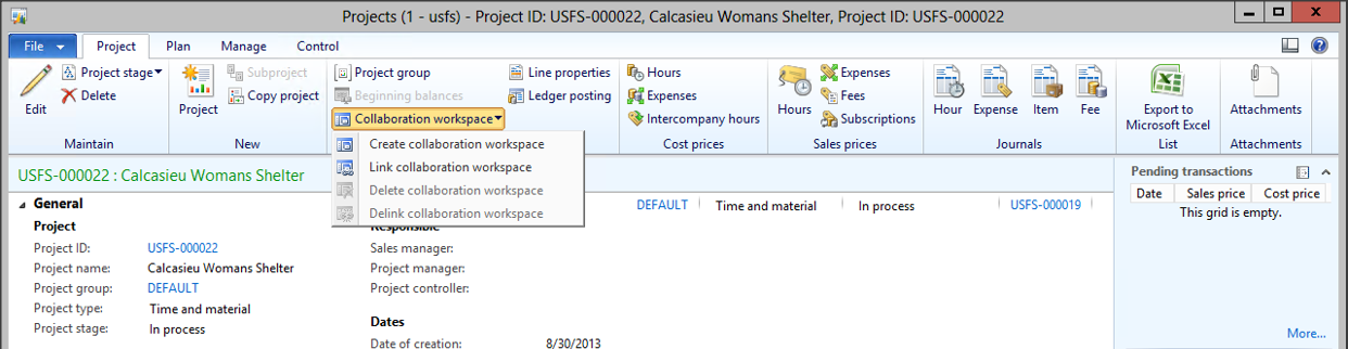 From the Projects master form, click on the Collaboration workspace menu button from the Setup group of the Project ribbon bar, and select the Create collaboration workspace option.
