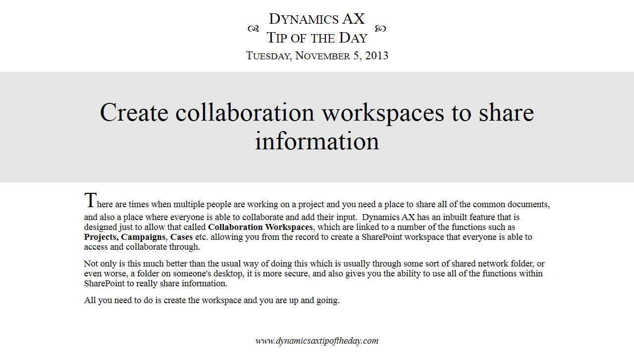 There are times when multiple people are working on a project and you need a place to share all of the common documents, and also a place where everyone is able to collaborate and add their input. Dynamics AX has an inbuilt feature that is designed just to allow that called Collaboration Workspaces, which are linked to a number of the functions such as Projects, Campaigns, Cases etc. allowing you from the record to create a SharePoint workspace that everyone is able to access and collaborate through.