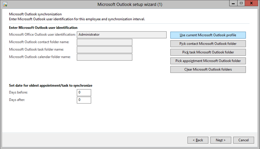Step through the wizard until you get to the Microsoft Outlook synchronization page, and click on the Use current Microsoft Outlook profile button to link the profiles. If your e-mail addresses match then your name should show up in the Microsoft Office Outlook user identification field.