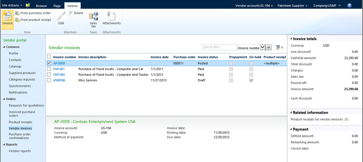 The vendor just needs to log into the Vendor Portal, and select the Vendor Invoices page from the Orders group, and then click on the Invoice button within the New group of the Invoice ribbon bar.
