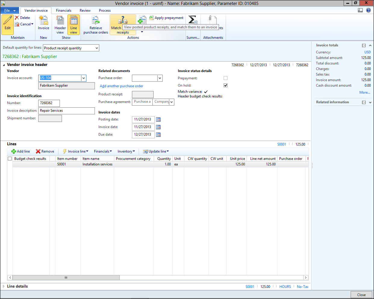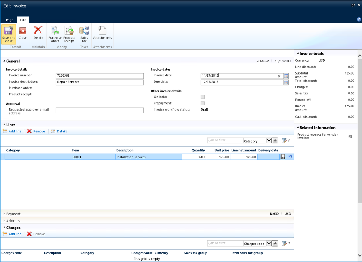 When the Edit Invoice window is displayed, they can enter in the invoice detailed, including the invoice lines, and when they are finished, click on the Save and close button within the Commit group of the Edit ribbon bar.