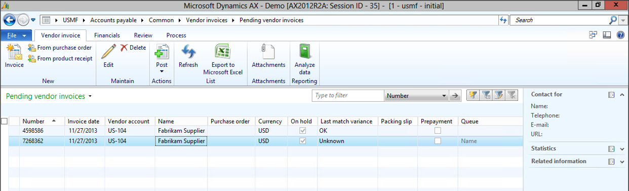 Within Dynamics AX, you will be able to see all of the pending invoices by clicking on the Pending Invoices menu item within the Vendor Invoices folder of the Common group of the Accounts Payable area page.