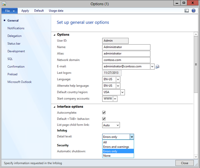 Within the General tab of the Options dialog box, you can change the detail level of the messages by selecting it from the Detail level drop down within the Infolog group of the Interface Options.