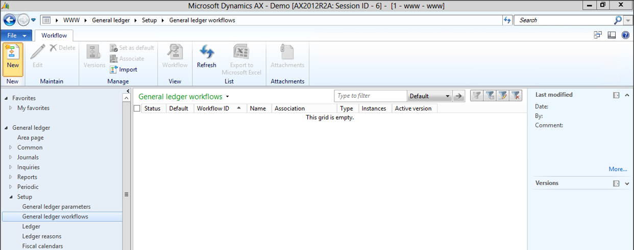 Before we start approving Journals, we need to create a workflow that we will use for the approval process.  To do this, open up the General ledger workflows maintenance form from within the Setup group of the General Ledger area page.