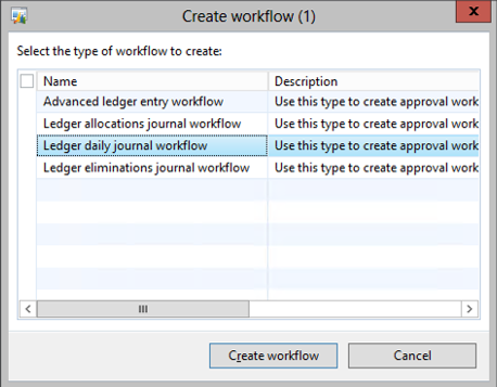 When the Create workflow dialog box is displayed, select the Ledger daily journal workflow item – since we are going to create a workflow for a journal type of Daily – and then click on the Create workflow button.