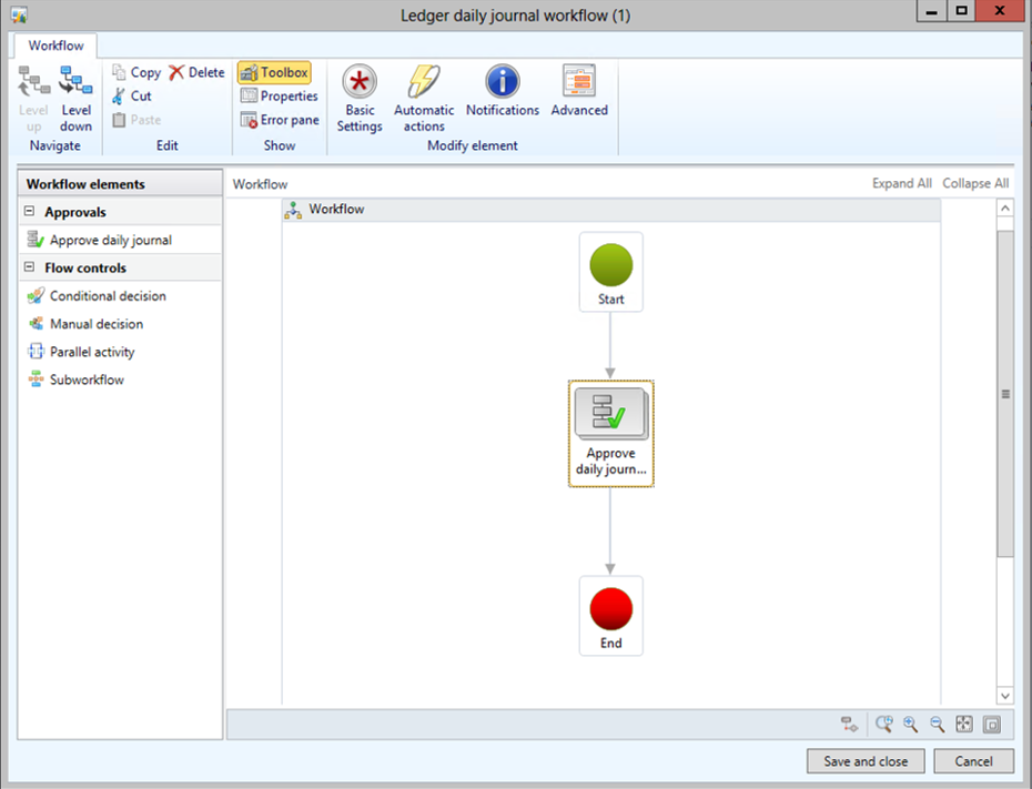 When you have done this, click on the Save and close button to save the workflow, and then activate it so that it is useable by Dynamics AX.