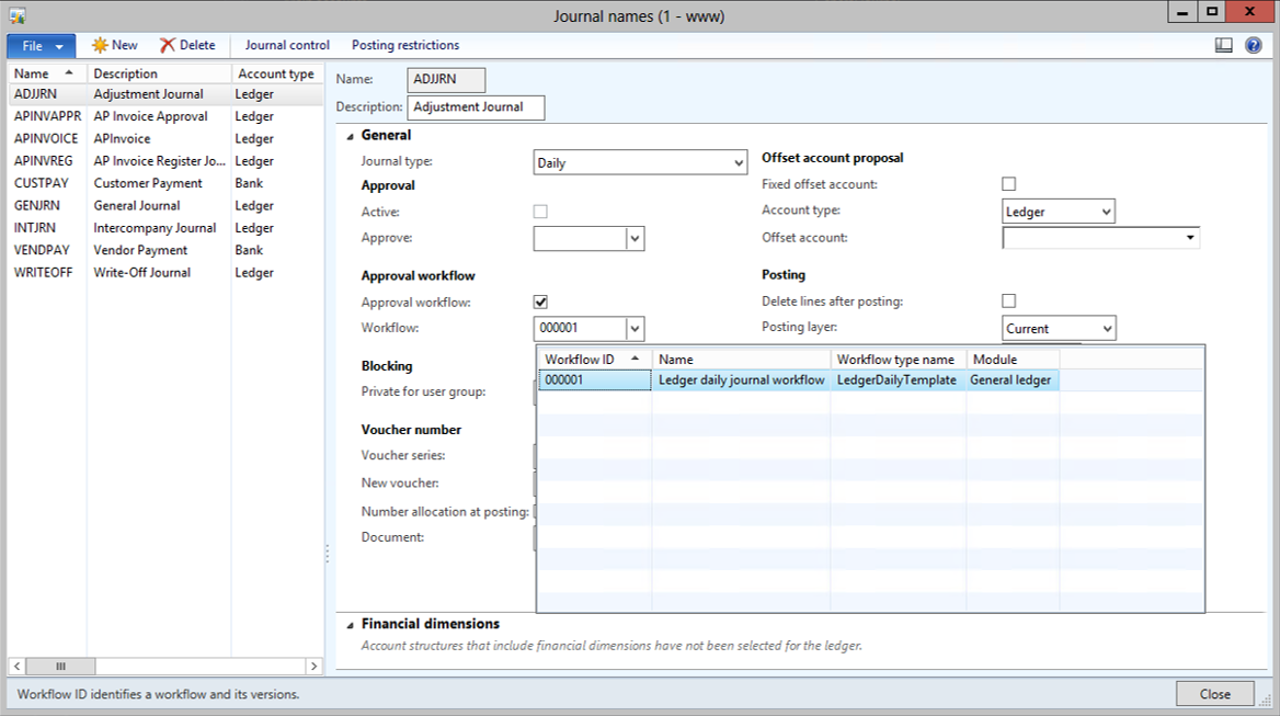 Select the journal that you want to have controlled by the workflow process that you just designed, check the Approval workflow checkbox within the Approval workflow group, and then from the Workflow dropdown, select the workflow template that you just designed.