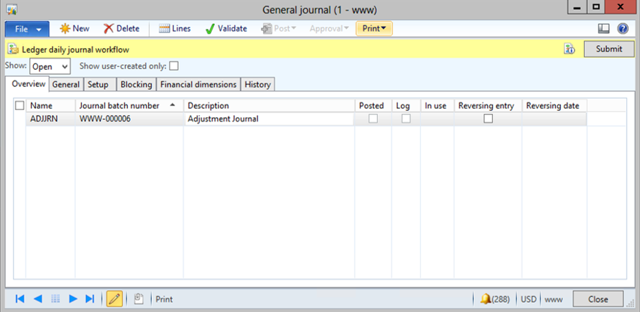 Now when you create a journal entry for the journal type that you enabled workflow on, the Post option will be disabled, and there will be a Submit button that you can click on to initiate the approval workflow.