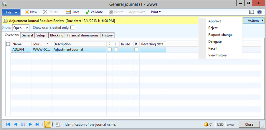 The alert will take them directly to the record that they need to approve, and if they click on the Actions button, they are able to select the action that they want to apply to the journal.  To allow the journal to be posted, all they need to do is select the Approve menu item.