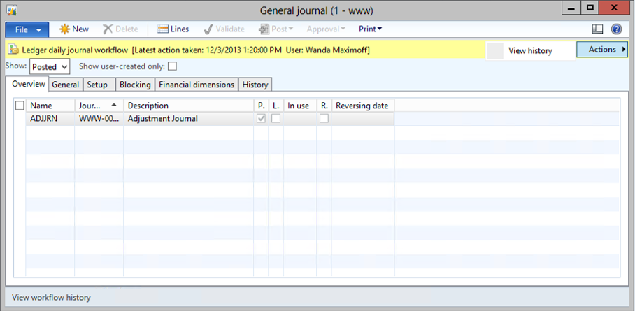 Once the journal is approved, then the journal becomes postable, and only option that will be available to the user is the View history option.