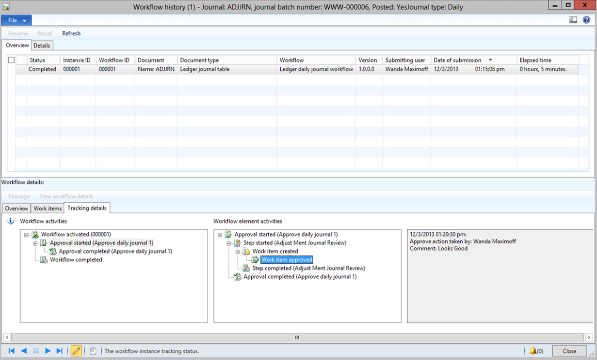 This allows the user to see the complete history of the workflow approval, and also any comments that were made during the submission and approval process.