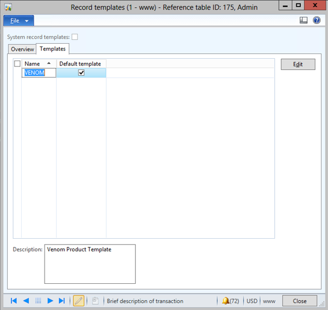 When the Record templates maintenance form is displayed, you will be able to see all of the records that have templates associated with them. In this case we just have templates for the Items.