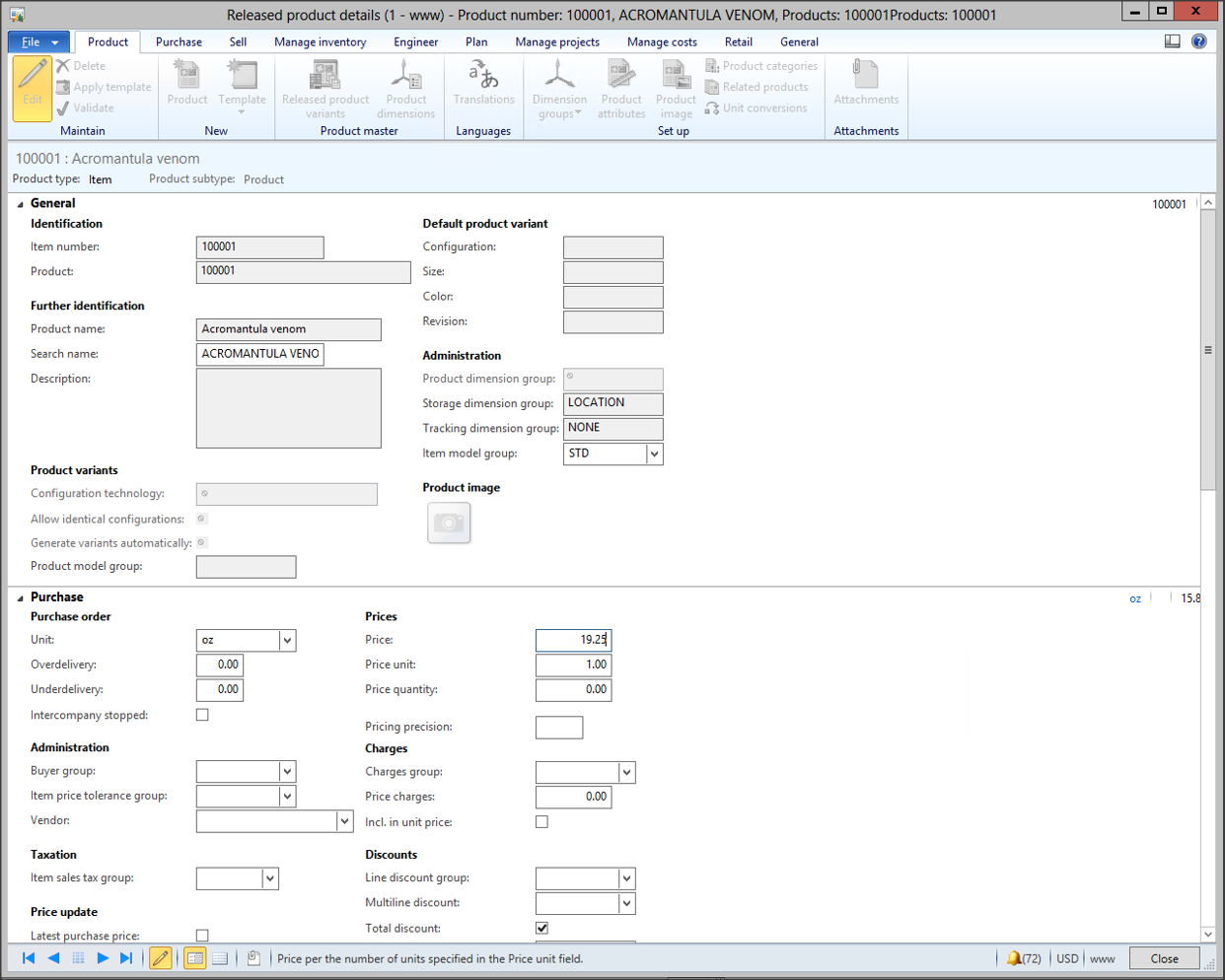 This will open up the Released product that you selected to be the product template, and you can make changes to the key information. Once you have updated the record, click the Close button, and the next time you create a product from that template it will use the new defaults that you defined.