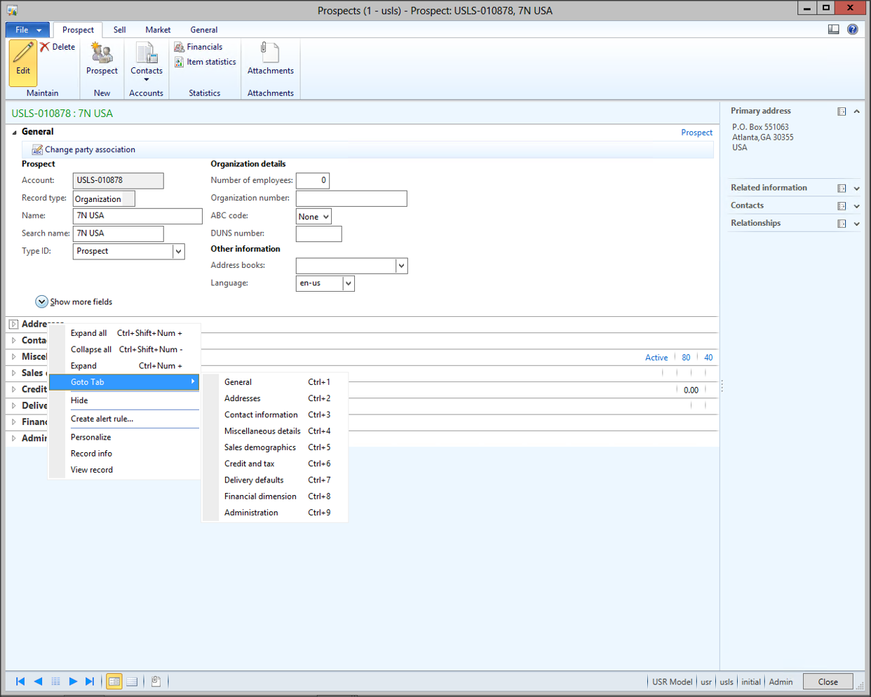 If you live and die by the keyboard, and only touch the mouse as a last resort then opening up a maintenance form within Dynamics AX 2012 is probably killing you because there are all of the tabs that you need to open in order to access the grouped data fields if you haven’t learnt the shortcut key to jump directly to the tab. All you need to do is press the CTRL key and the tab number that you want to access, and Dynamics will take you directly there without the use of the mouse.
