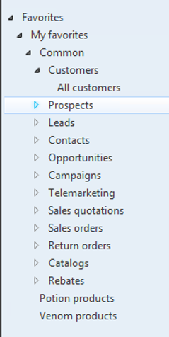 Right-mouse-click on the menu heading that you want to add to your favorites and select the Add to Favorites option. In this case I selected the Common group of the Sales and Marketing.