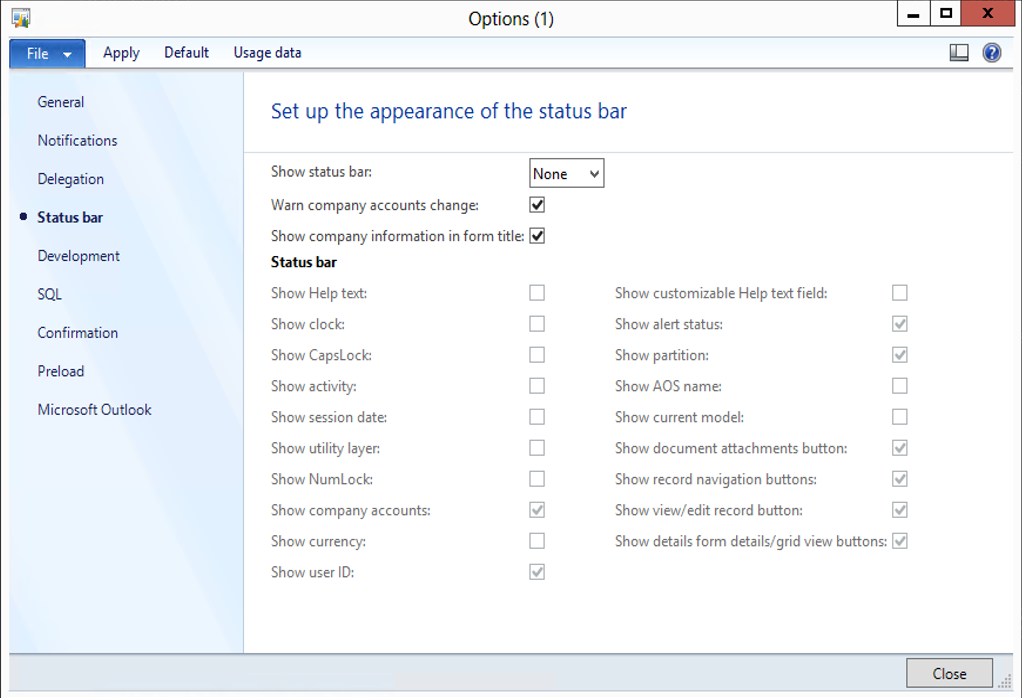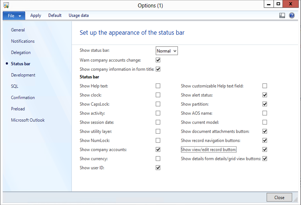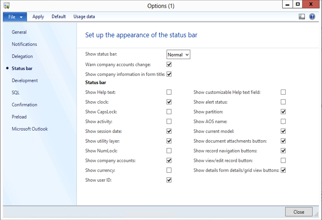 The Status Bar within the Dynamics AX client is there to give you a quick way to see some of the configuration parameters without adding too much extra clutter to the client. But by default it may show you a little more information than you really need. If you like things to be tidy, and not see information that you’re not interested in then you may want to tweak the information that shows on the Status Bar through the System Options.