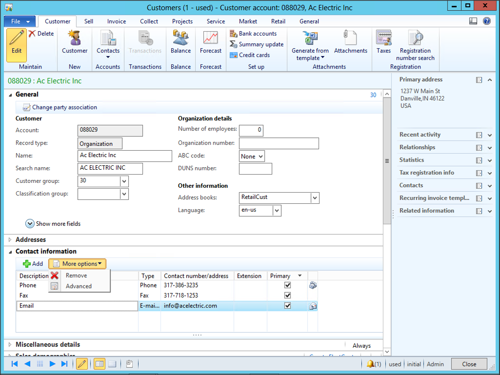 Within your Customer maintenance form, open up the Contact Information tab, and from the More options menu button within the tab, select the Advanced menu item.