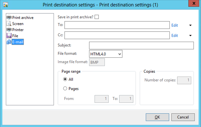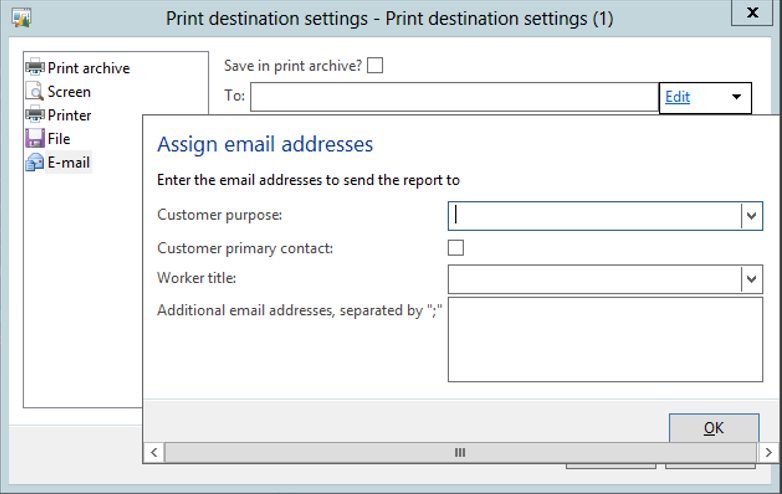 When the Print Destination Settings dialog box is displayed, click on the Edit menu button to the right of the To field.