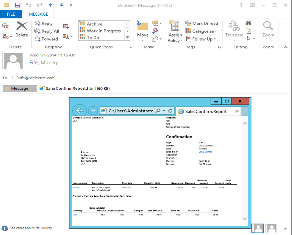 This will create an e-mail message to the email account on the Customer that is has the same Purpose, and attach the Order Confirmation document to it, all in one fell swoop.