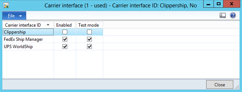 When the Carrier Interface maintenance form is displayed, check the Enabled and Test Mode check boxes for the FedEx and UPS Carrier Interface ID’s.