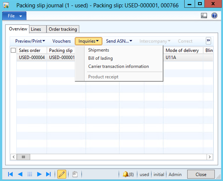 Also, if you want more detailed information on the tracking details for the shipment, click on the Inquiries menu button within the Overview tab of the Packing Slip Journal inquiry form, and select the Carrier Transaction Information option.