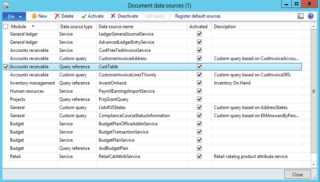 When the Document Data Sources maintenance form is displayed, click on the New button in the menu bar, and add a new record that has a Document Source Type of Query Reference and a Data Source Name of CustTable