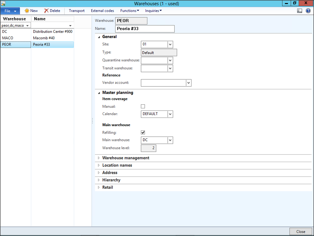Dynamics AX allows you to specify warehouses that are designated to refill other warehouses. This feature is really useful because it will make MRP top up the stock within the child warehouses through transfers rather than a purchase order, and then plan to purchase more product at the refilling warehouse to cover the demand. There is also no limit to the number of levels that you can have, so smaller retail locations can be refilled from area distribution centers, which could be replenished from a central production of receiving center.