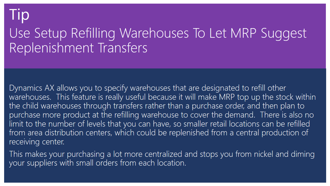 Dynamics AX allows you to specify warehouses that are designated to refill other warehouses. This feature is really useful because it will make MRP top up the stock within the child warehouses through transfers rather than a purchase order, and then plan to purchase more product at the refilling warehouse to cover the demand. There is also no limit to the number of levels that you can have, so smaller retail locations can be refilled from area distribution centers, which could be replenished from a central production of receiving center.