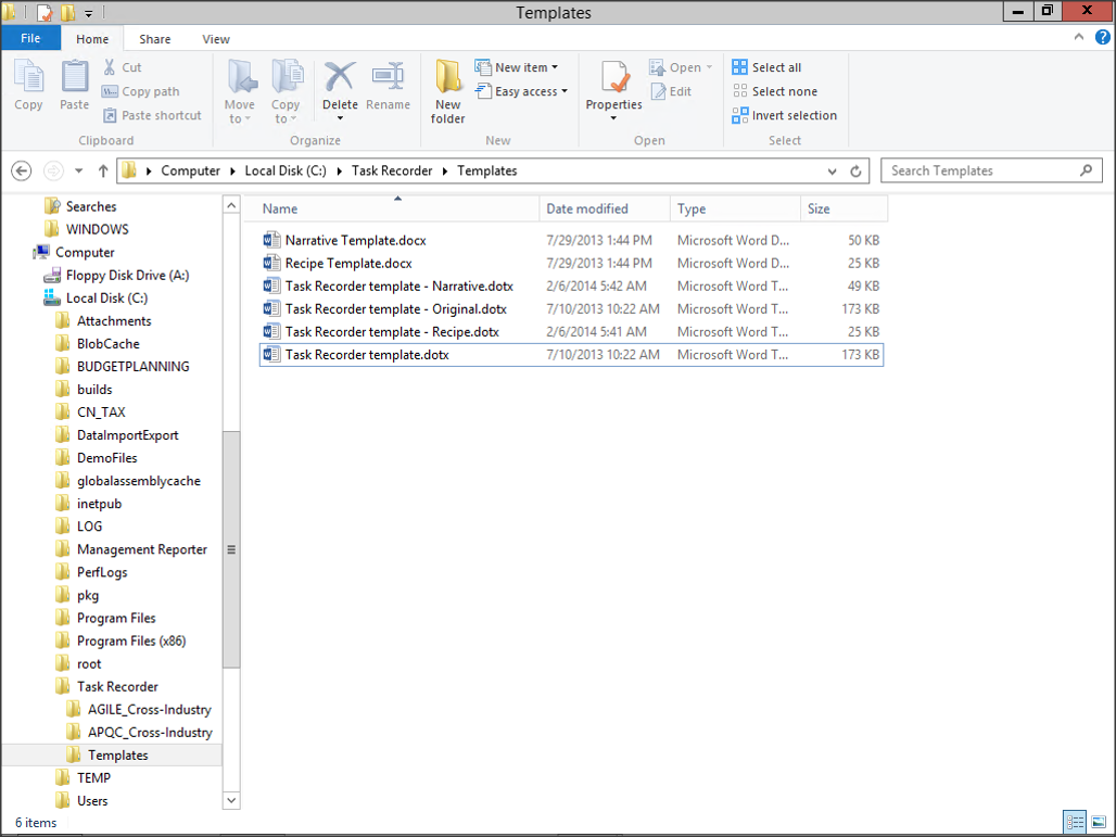 Locate the Task Recorder Templates folder within the file explorer and open the Task Recorder template.dotx template file.