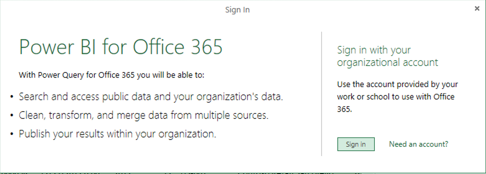 When the Power BI for Office 365 sign in dialog appears, follow the steps to sign in.
