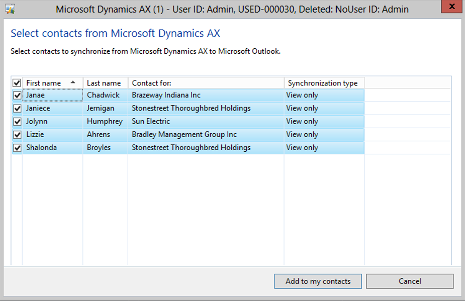When the Select contacts from Microsoft Outlook dialog box is displayed, all of the contacts that have not currently been synchronized Outlook to Dynamics AX will be displayed.