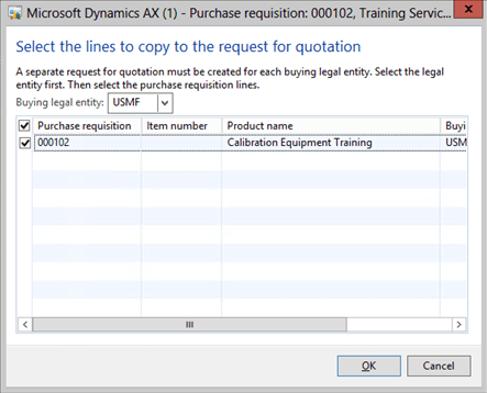 This will open up a dialog box where you can select the lines that you want to submit for Request For Quote. After selecting all the lines that you want to convert to a RFQ click on the OK button to exit from the form.