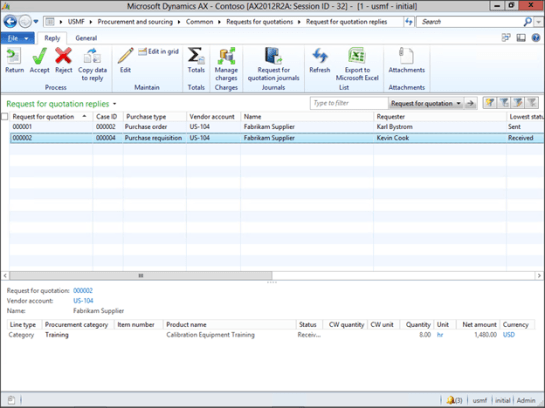 Then it’s a matter of waiting for the Vendor to respond to your Request For Quotation (hopefully they will be able to use the on-line Vendor Portal) and if you want to use the quoted values in your Requisition, just click on the Accept button within the Process group of the Reply ribbon bar.