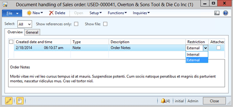 When the Document Handling dialog box is displayed, add a new note with the same Type that you specified in the form setup, add the notes into the body of the attachment, and then set the Restriction field to External.