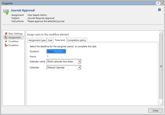 When the workflow step properties dialog box is displayed, select the Time Limit tab from the Assignment group, and set the time that you want task to be available for approval.