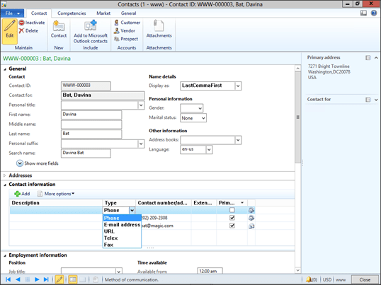 By default, Dynamics AX lets you track the common information against contacts like phone numbers, email addresses, web sites, and telex (who the heck even uses that).