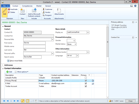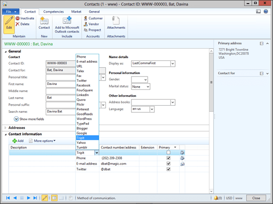 The contact management feature within Dynamics AX allows you to track an unlimited number of phone numbers, email addresses, and websites against a contact. But these are just the direct contact types. We live in the age of Social Media, and there are so many other different sources of information that we want to track against our contacts. Don’t’ despair, with a small tweak to the configuration within Dynamics AX, you can add additional contact media types and start tracking all this information.