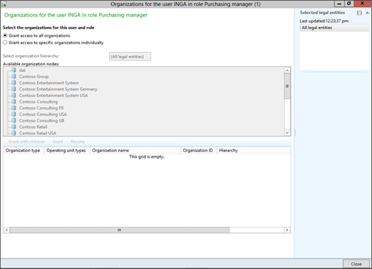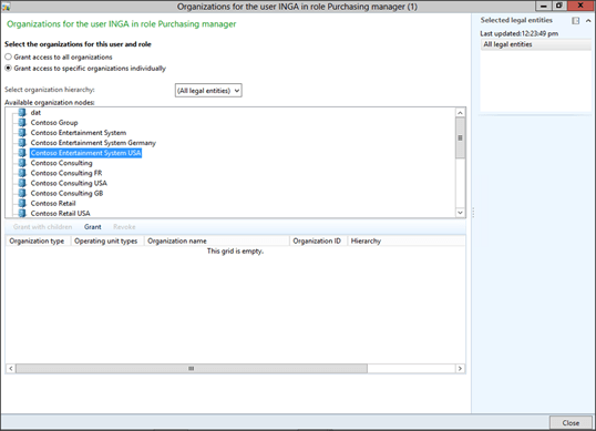 This will allow you to select from the Available Organization Nodes. Select Organization that you want to grant the user access to, and then click on the Grant button.