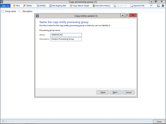 When the Name The Copy Entity Processing Group page is displayed, give your record a Name and Description and then click on the Next button.