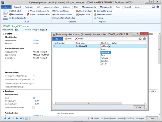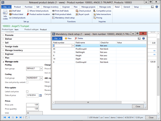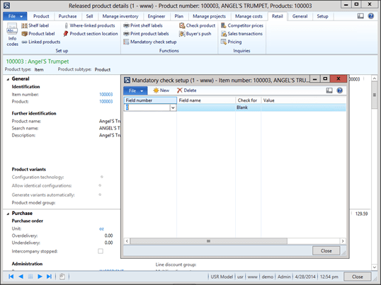 To set up the fields to check, open your Released Products maintenance form and click on the Mandatory Check Setup button within the Functions group of the Retail ribbon bar.