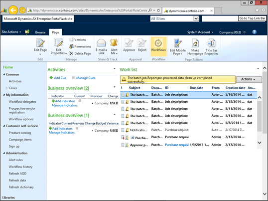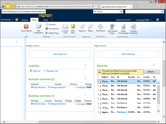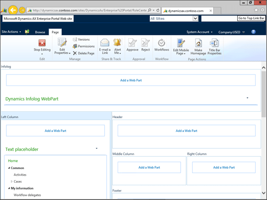 This will open up the Web Part browser above the page. Select any of the standard web parts delivered with SharePoint and also Dynamics AX that you want to add to the page, and then click the Add button.