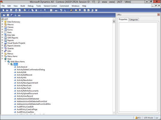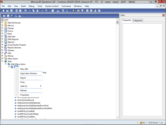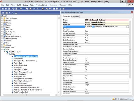 The next step is to create a menu item for the Role Center within AOT. To do this you can go directly into the AOT tree and drill down into the URLs node within the Web Menu Items folder of the Web group.